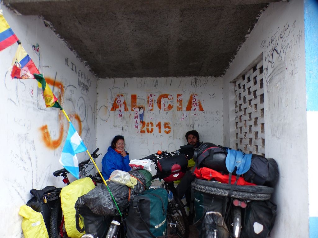 Pause-pluie dans une conduite d’eau sous la route. Qu’est-ce-qu’on fait en attendant ? Bah, on mange un morceau ?