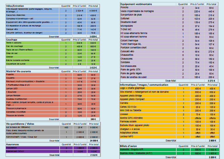 Le budget, ça reste le nerf de la guerre…ce sont de longues années à économiser en prévision de ce voyage, et c’est une recherche au jour le jour des meilleurs prix pour une qualité (notamment sur le matériel courant – vélo, vêtements, couchage) que l’on espérera infaillible, ou presque!